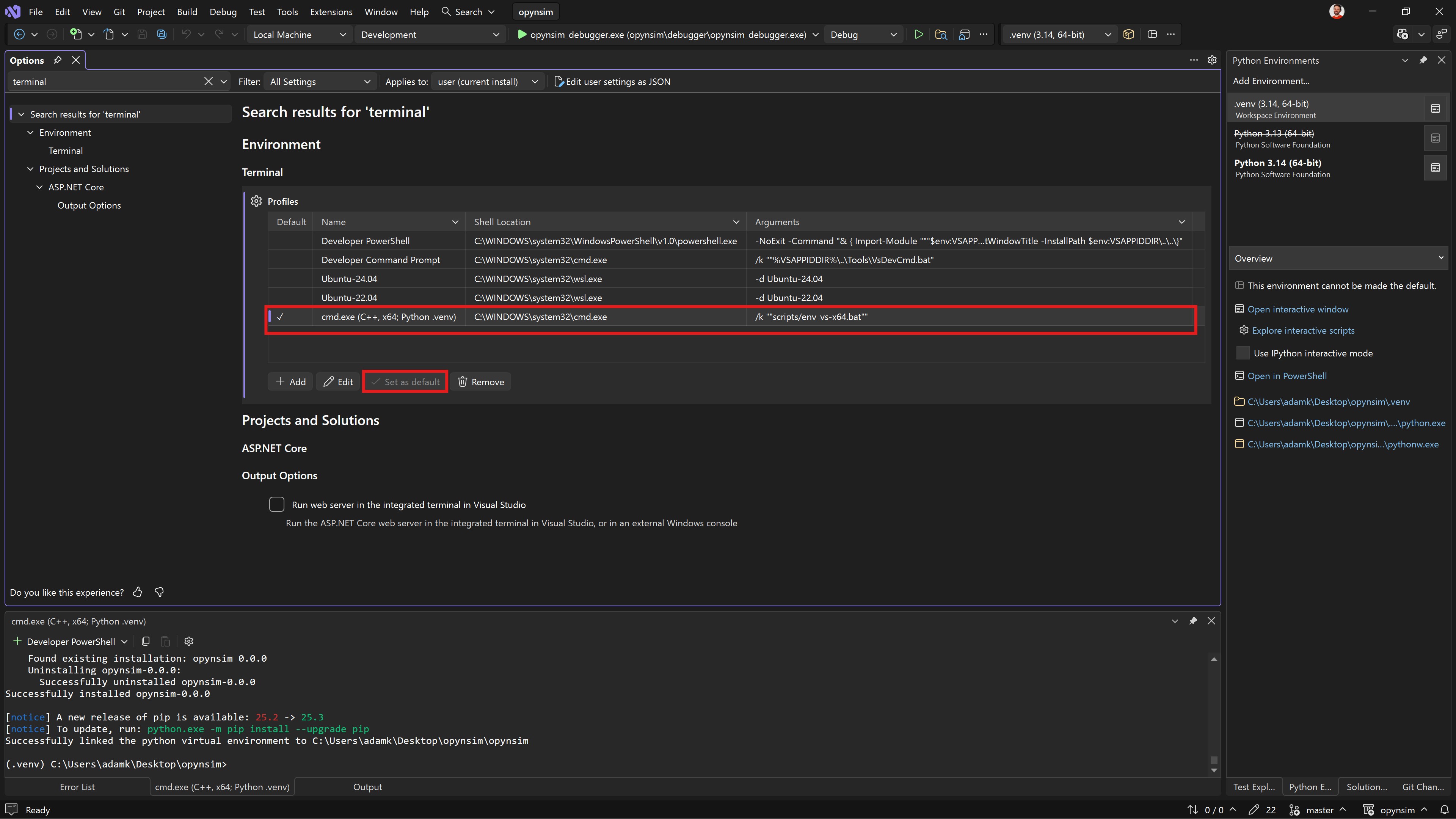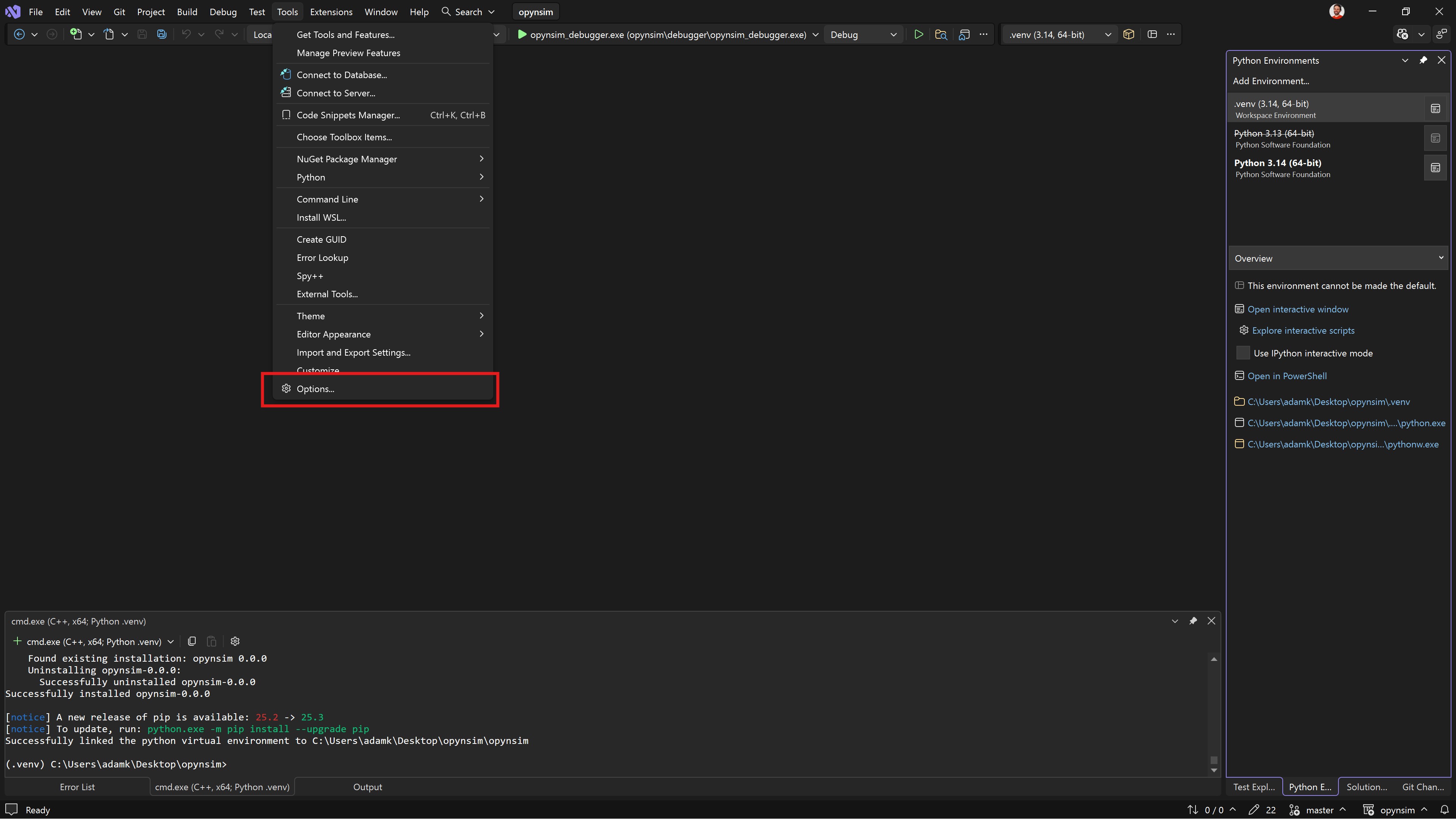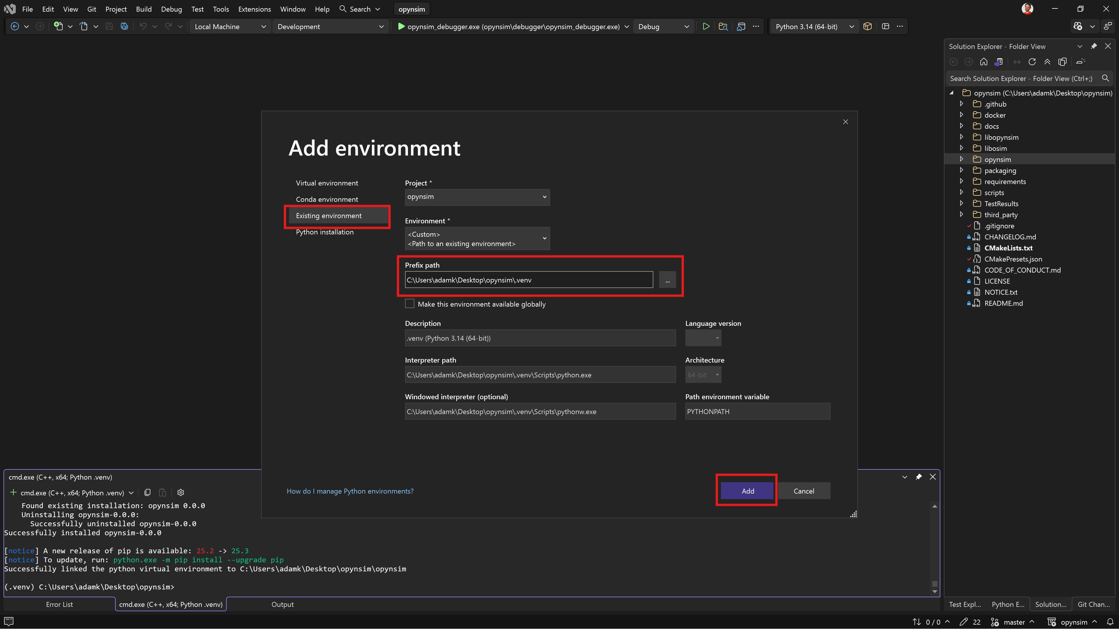 opynsim_debugger.exebecause those virtual environments aren’t on the PATH for Visual Studio.