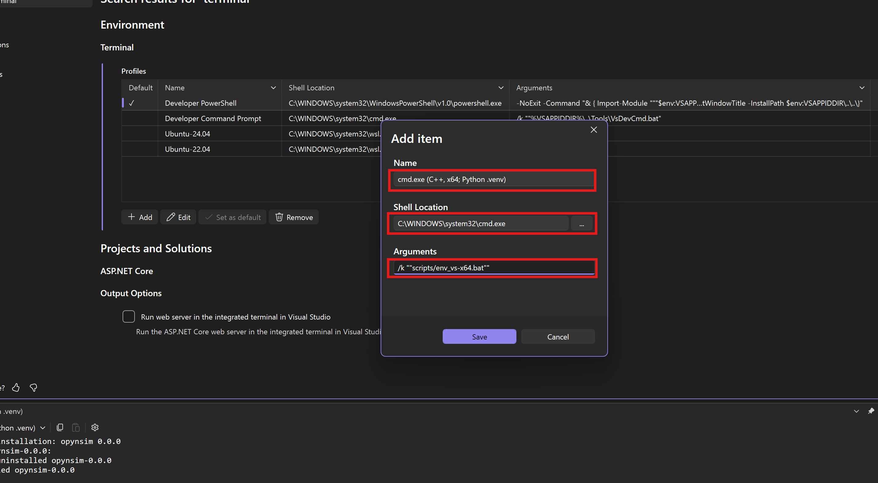 Fig. 2.15 Fill out the terminal details. opynsim includes a batch script (scripts/env_vs-x64.bat),