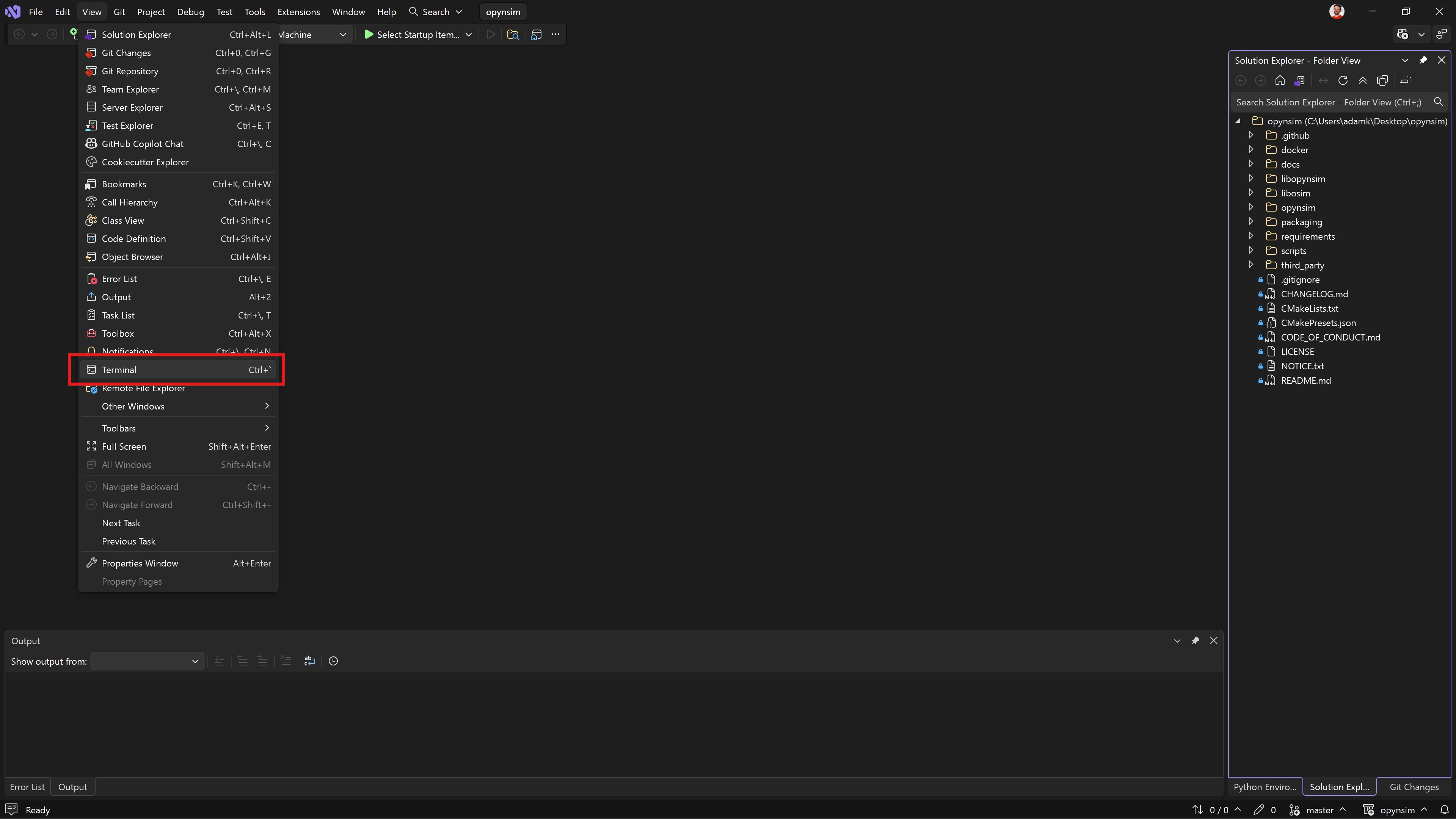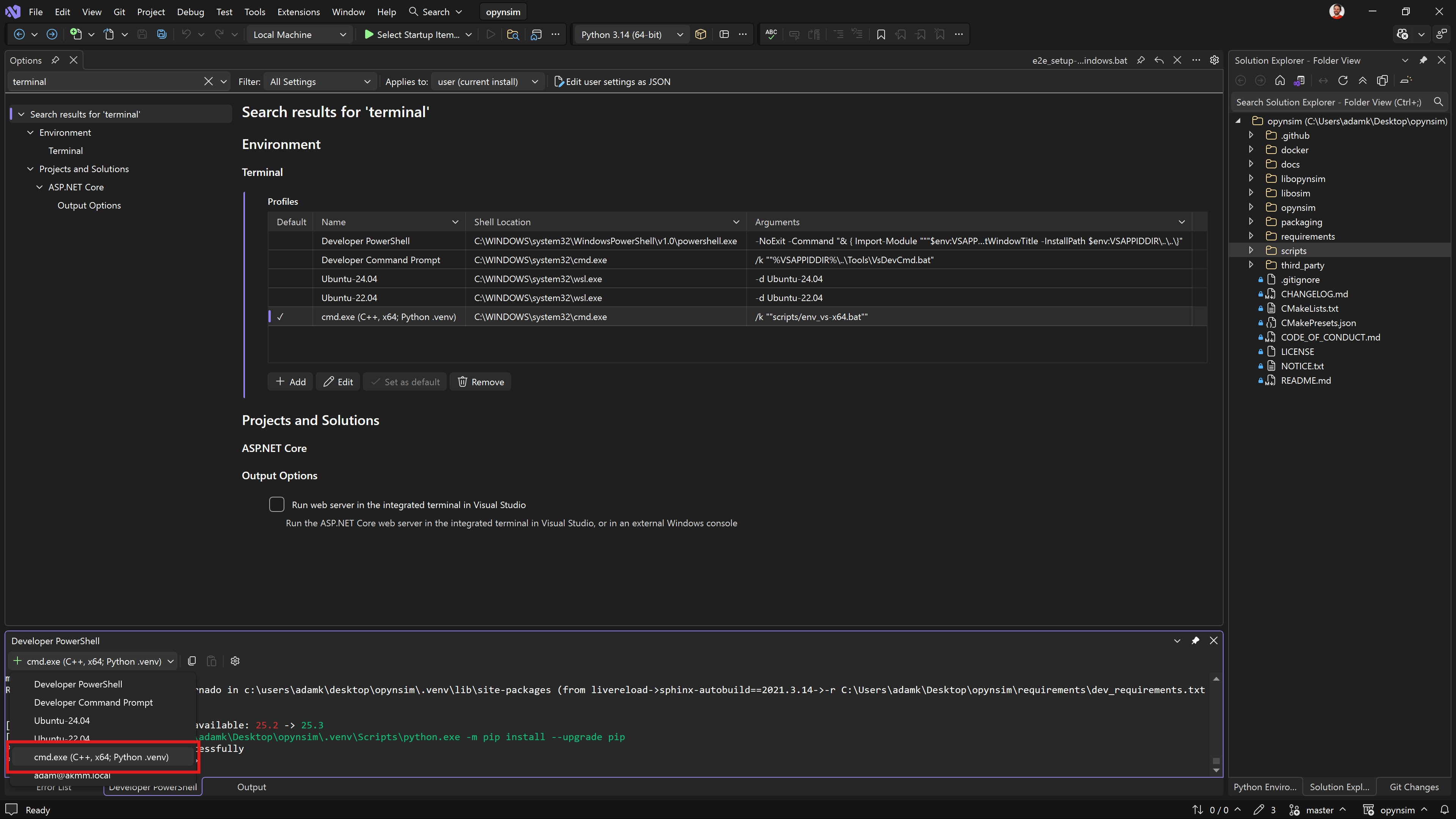 This step sets up the terminal in Visual Studio to use the python virtual environment and also have access to the C++ environment (compiler, cmake, etc.).