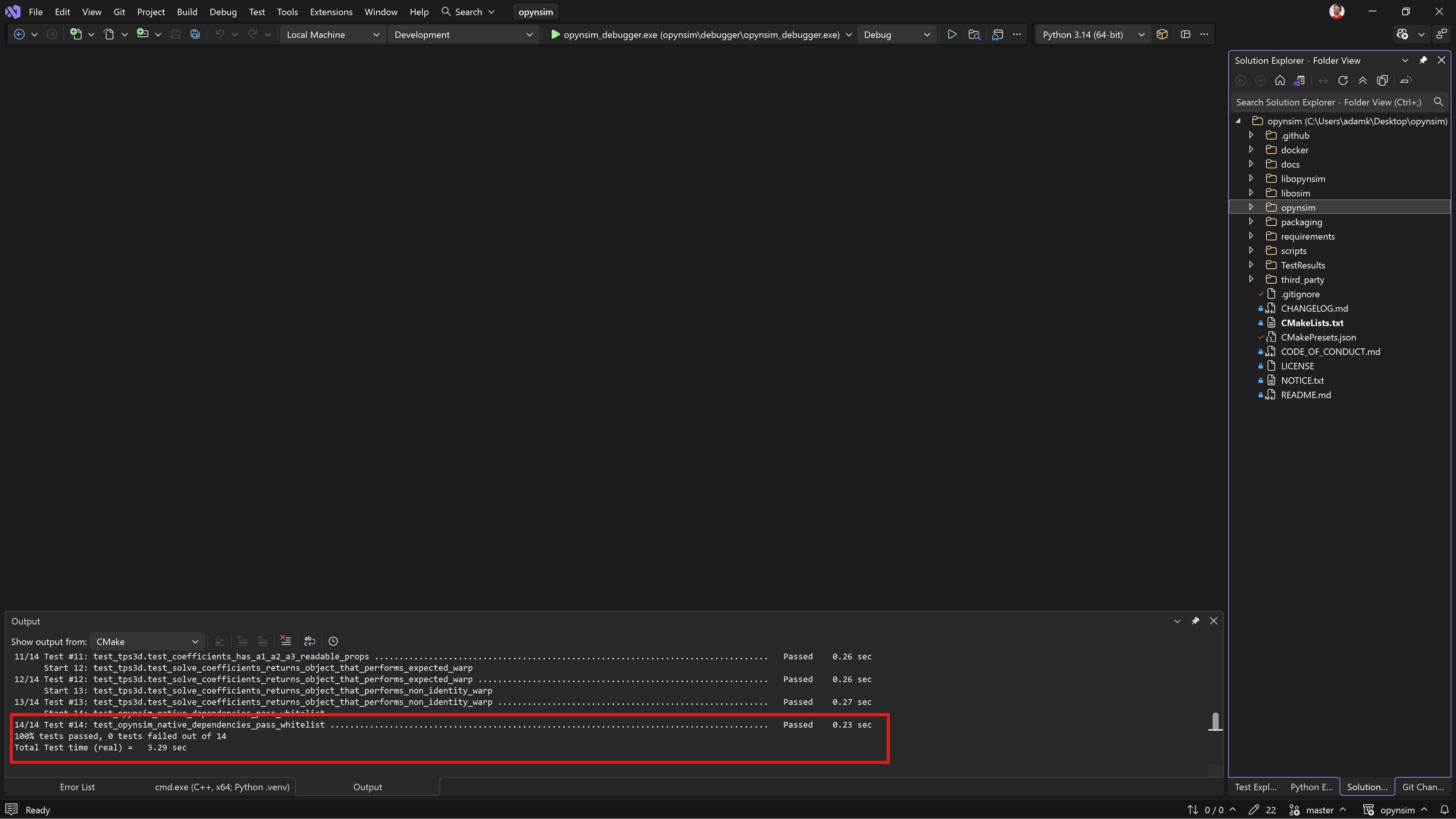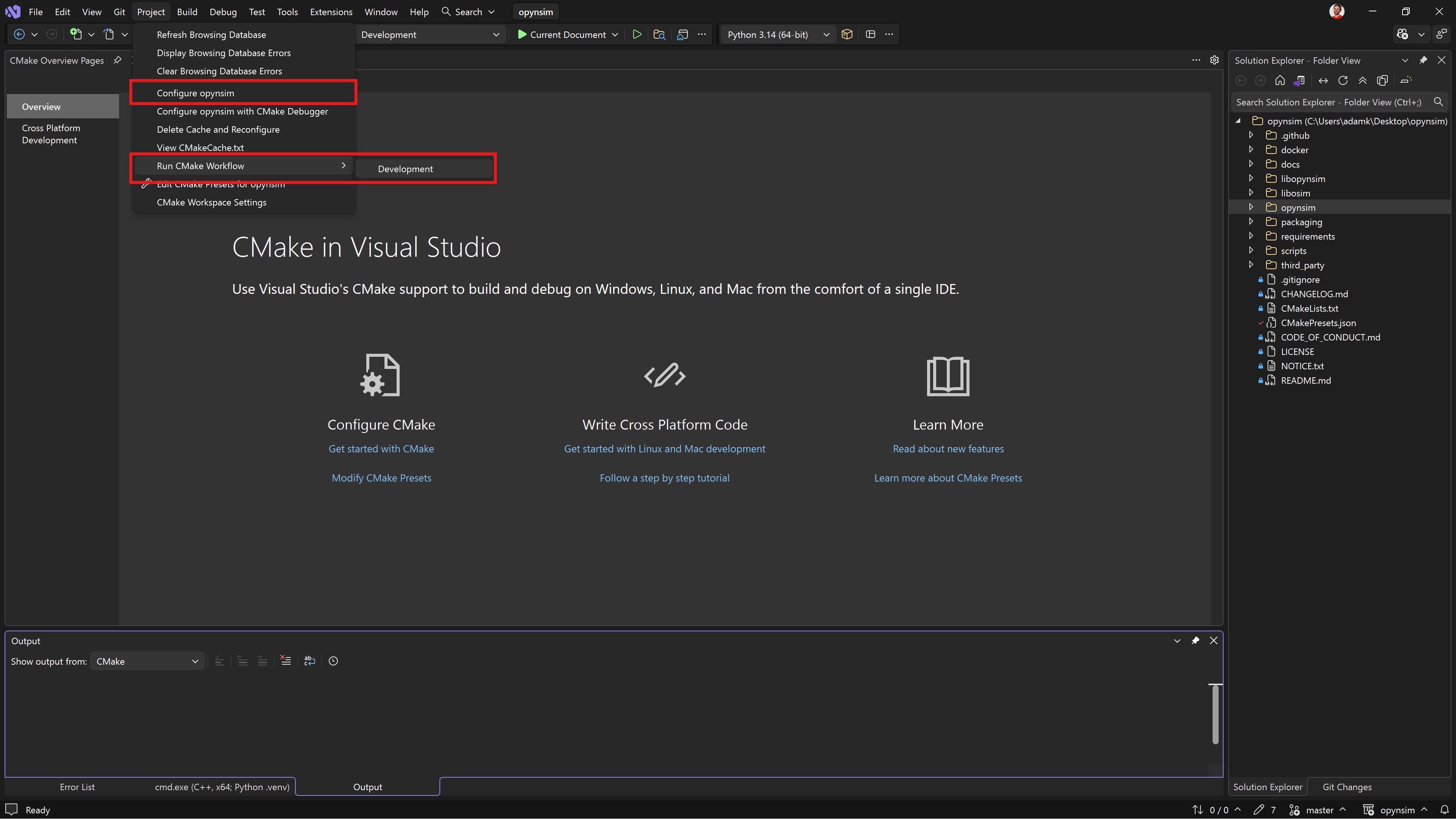 Fig. 2.20 Now build opynsim. We have provided a Development workflow preset that builds and tests