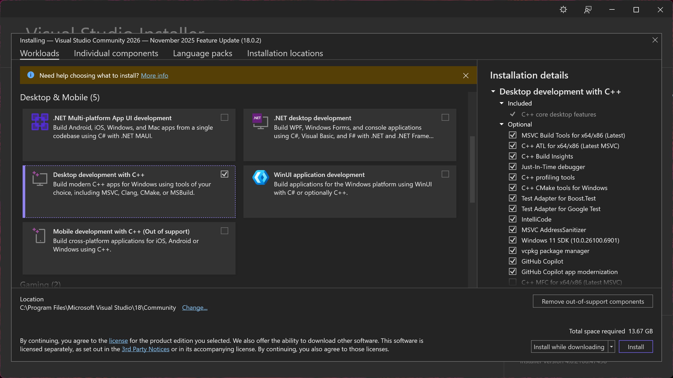 select which workloads you are developing. For the best experience when developing