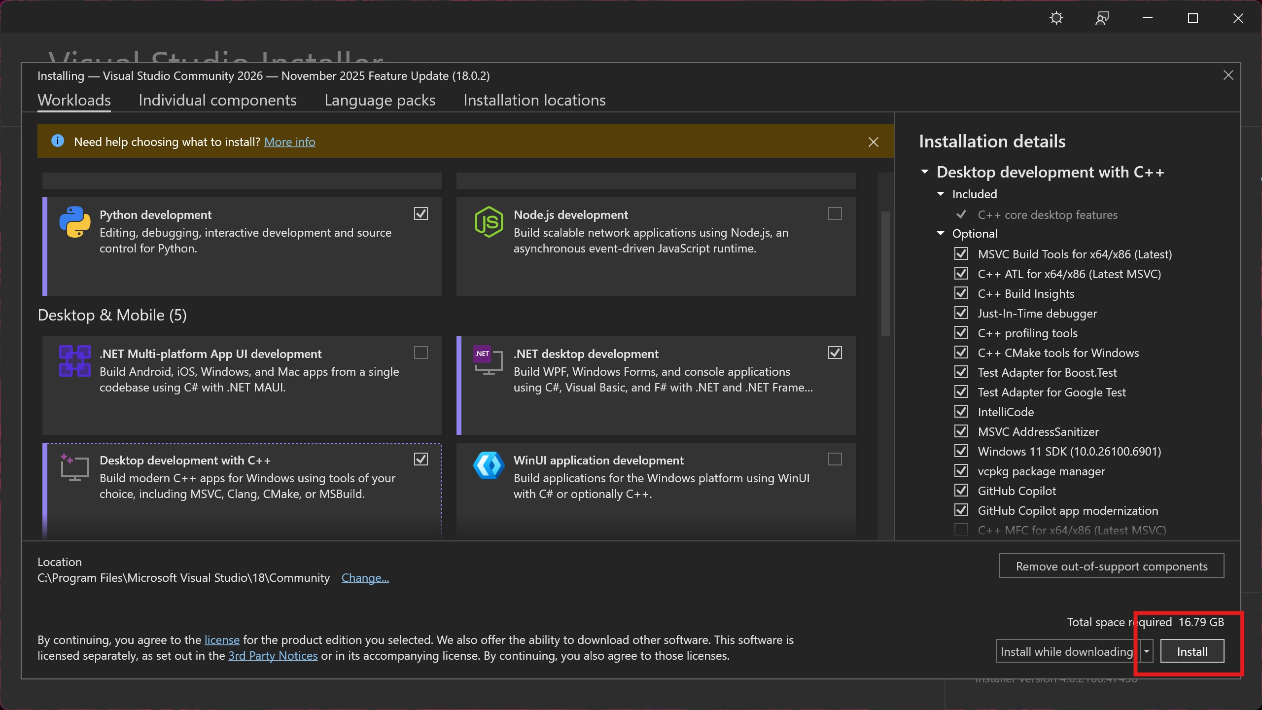 Fig. 2.4 Once you have selected the desired workflows (at least “Python Development” and “Desktop development with C++”), install Visual Studio.#