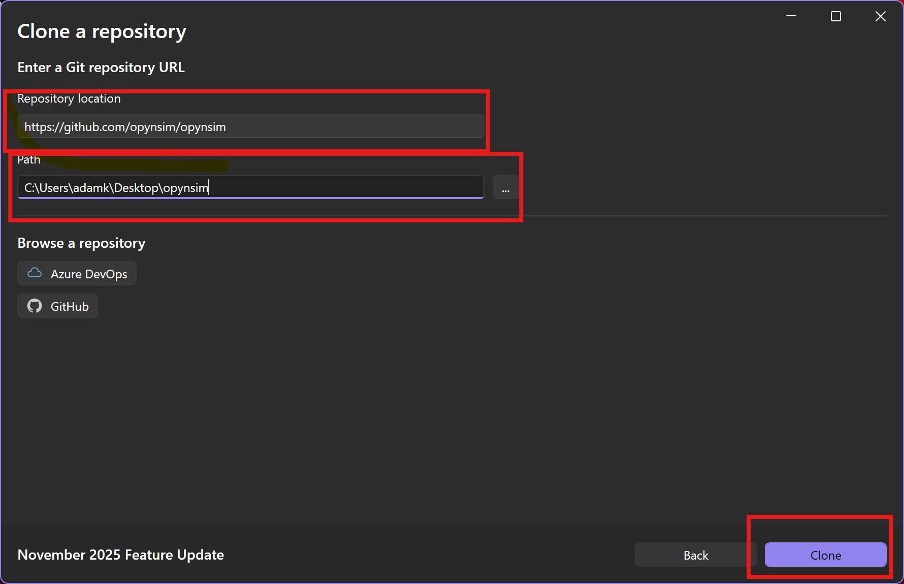Fig. 2.6 Fill out opynsim’s details in the “Clone a Repository” prompt. The URL of opynsim’s
